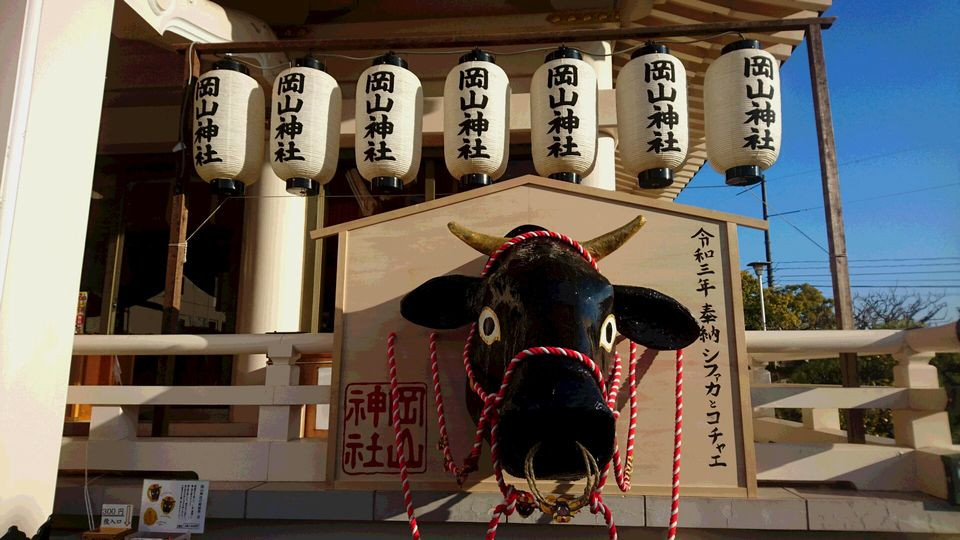 岡山神社の狛犬は未だにマスクを着けたまま。